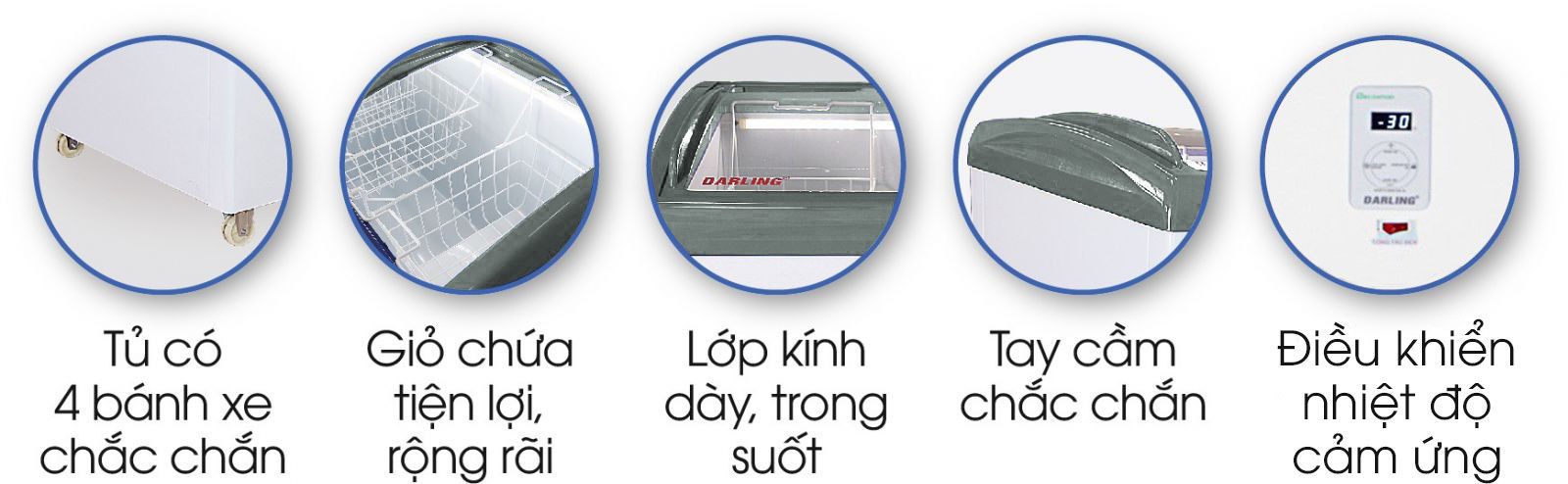 Tủ đông Darling có dung tích lớn, lòng tủ 1 ngăn đông rộng rãi, bên trong có rổ đựng thuận lợi cho việc phân loại thực phẩm. Bên cạnh đó, tủ còn được thiết kế cửa kính cong nắp trượt có hệ thống đèn led chiếu sáng trong tủ, giúp dễ dàng lựa chọn loại thực phẩm bảo quản trong tủ.